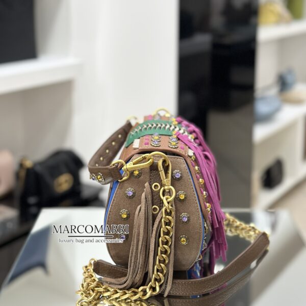 Borsa a mano in multimateriale, ecopelle e raffia, con borchie e frange in suede, manico e tracolla rimovibili