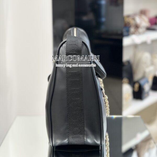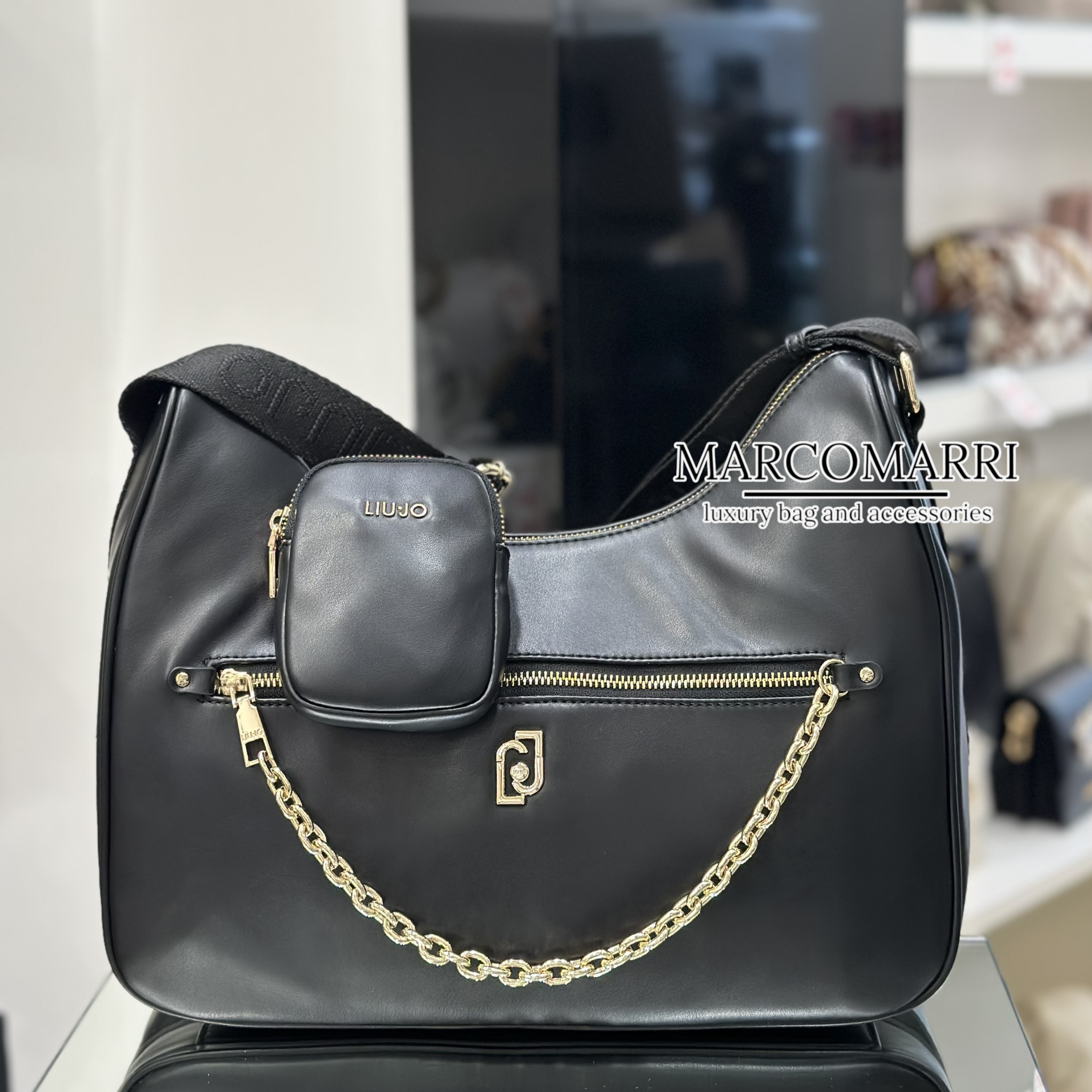 Questa borsa è la tua compagna di avventure. Il design multitasche è arricchito da un’elegante catena dorata che spicca sulla silhouette total-black. Pronta a seguirti ovunque i tuoi sogni ti portino.
