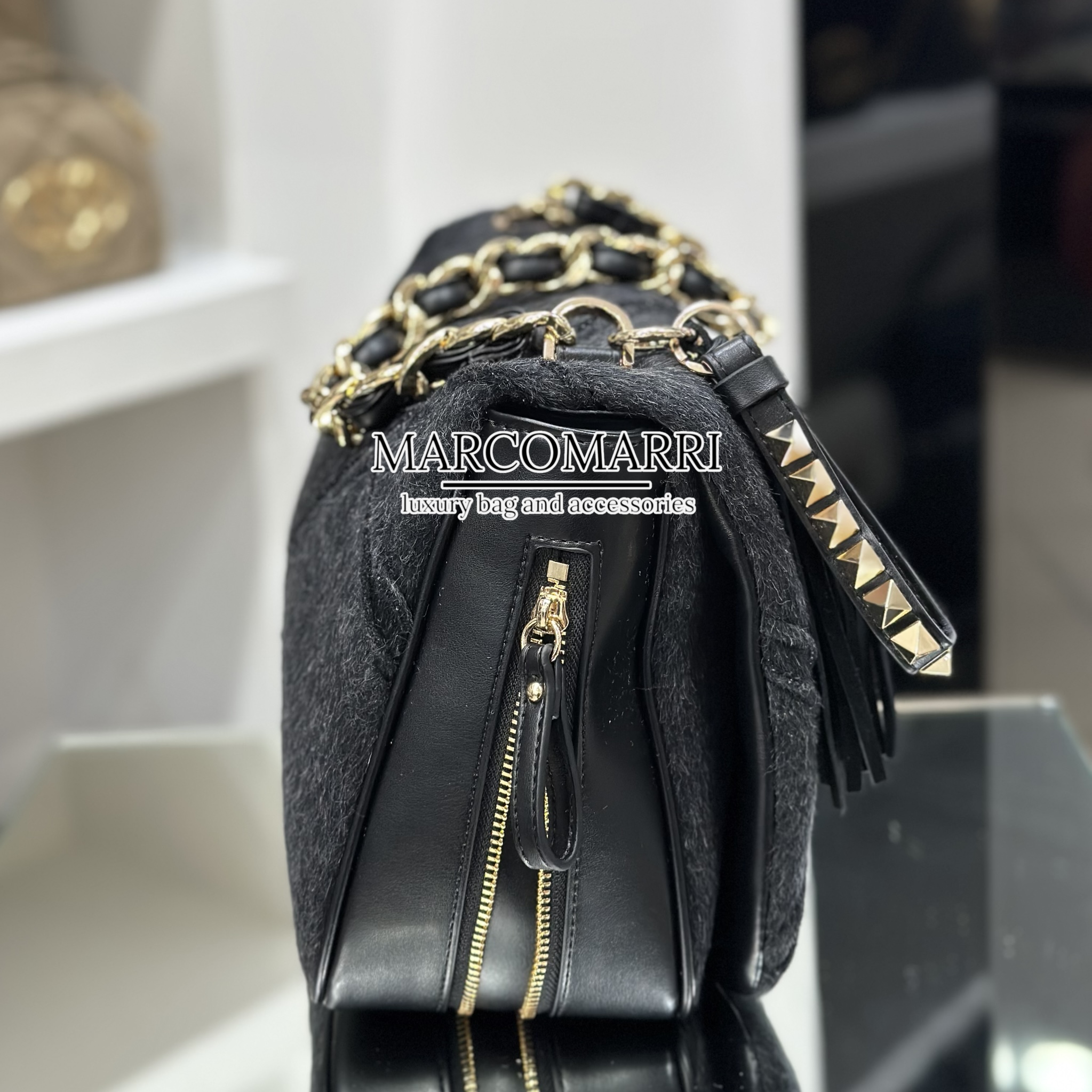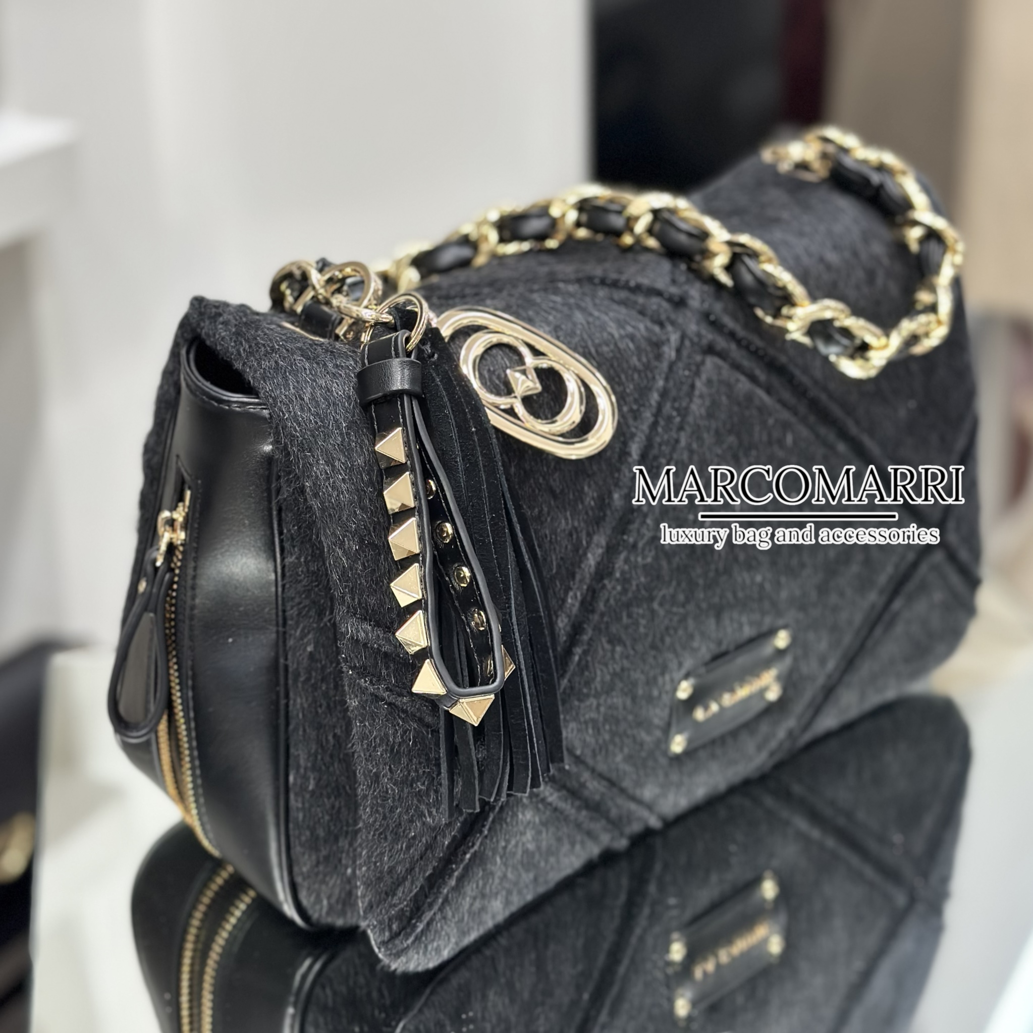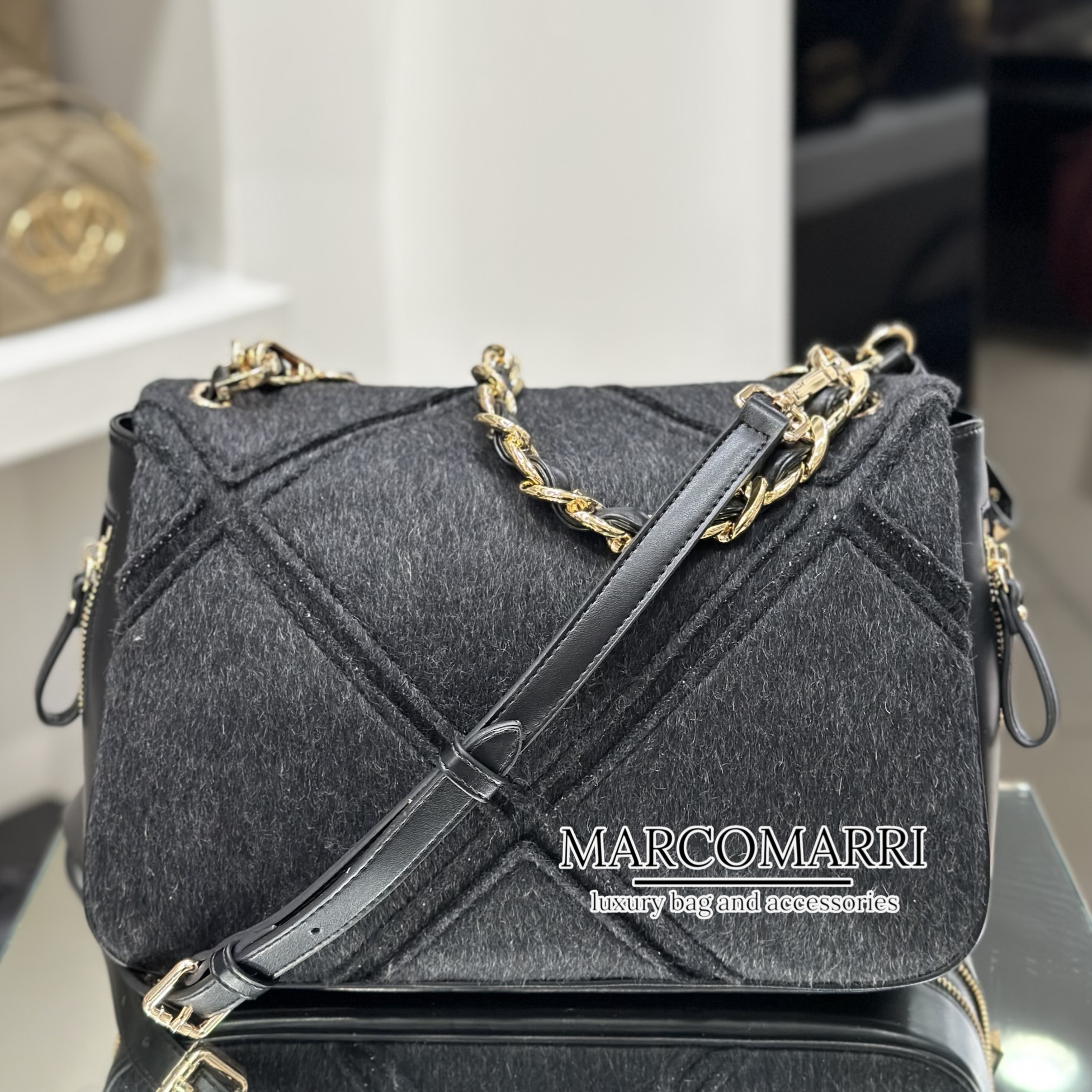 Borsa a spalla con patta in lana cotta ed ecopelle, con motivo a rombi, manico in ecopelle e catena e tracolla rimovibile.