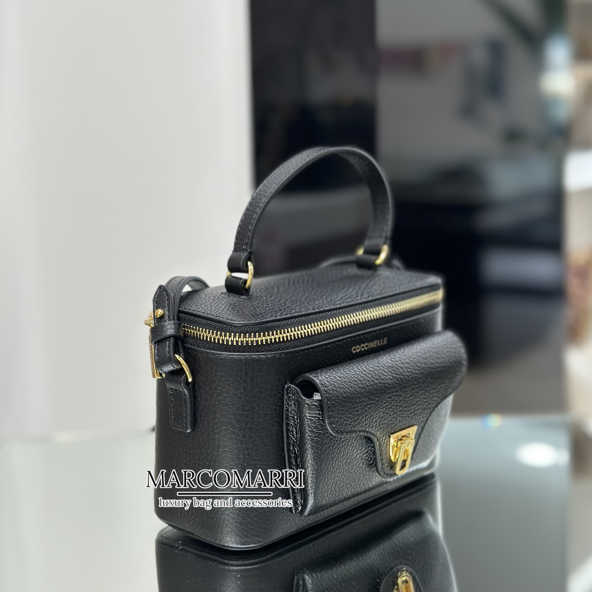 Coccinelle Beat è una tra le icone del brand: la distintiva chiusura a battente con il plettro è il simbolo d’identità Coccinelle. Il mini vanity case con tracolla in pelle è un mix perfetto tra struttura e morbidezza, tra praticità e design contemporaneo. Questo modello è realizzato in pelle lavorata tramite specifici macchinari e poi bottalata al fine di mantenerne la morbidezza. È una pelle molto resistente che si presta a una facile pulizia, ideale per un uso quotidiano.