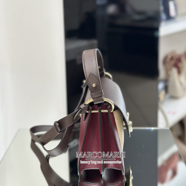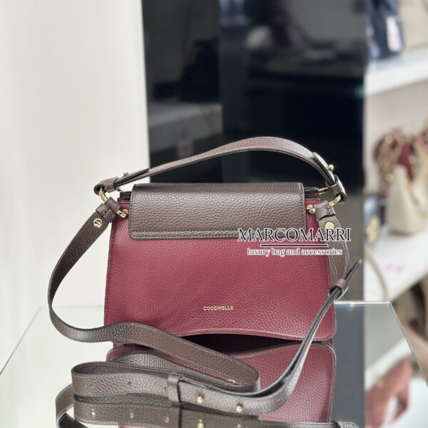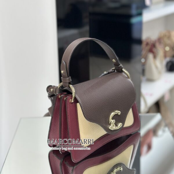 Una nuova signature entra a far parte del brand, Coccinelle C-Me multicolor ribes, brown, cream. Il logo reinterpretato attraverso la C di Coccinelle che si annoda e abbraccia il plettro, elemento iconico del brand, un’unione che si intreccia con la vita di una donna tra passato e presente. Le linee geometriche e le curve sofisticate rafforzano il design, mentre la costruzione a soffietti aggiunge un tocco di funzionalità e delicata eleganza a questa borsa che vuole essere la compagna essenziale della donna Coccinelle durante la sua giornata. Questo modello è realizzato in pelle lavorata tramite specifici macchinari e poi bottalata al fine di mantenerne la morbidezza. È una pelle molto resistente che si presta a una facile pulizia, ideale per un uso quotidiano.