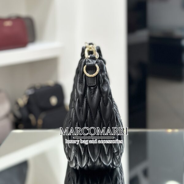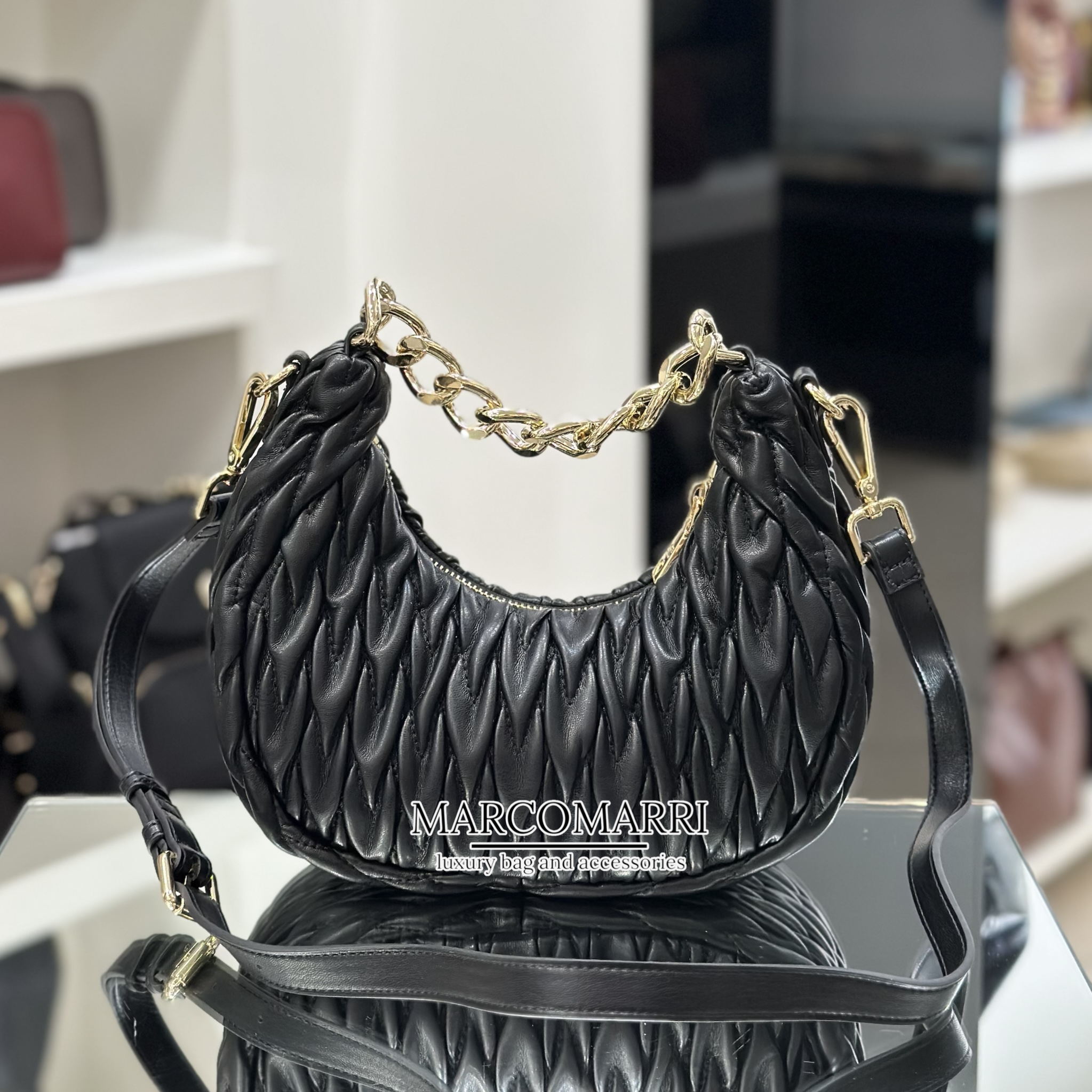 Manico in catena e tracolla in tinta con la borsa removibile.