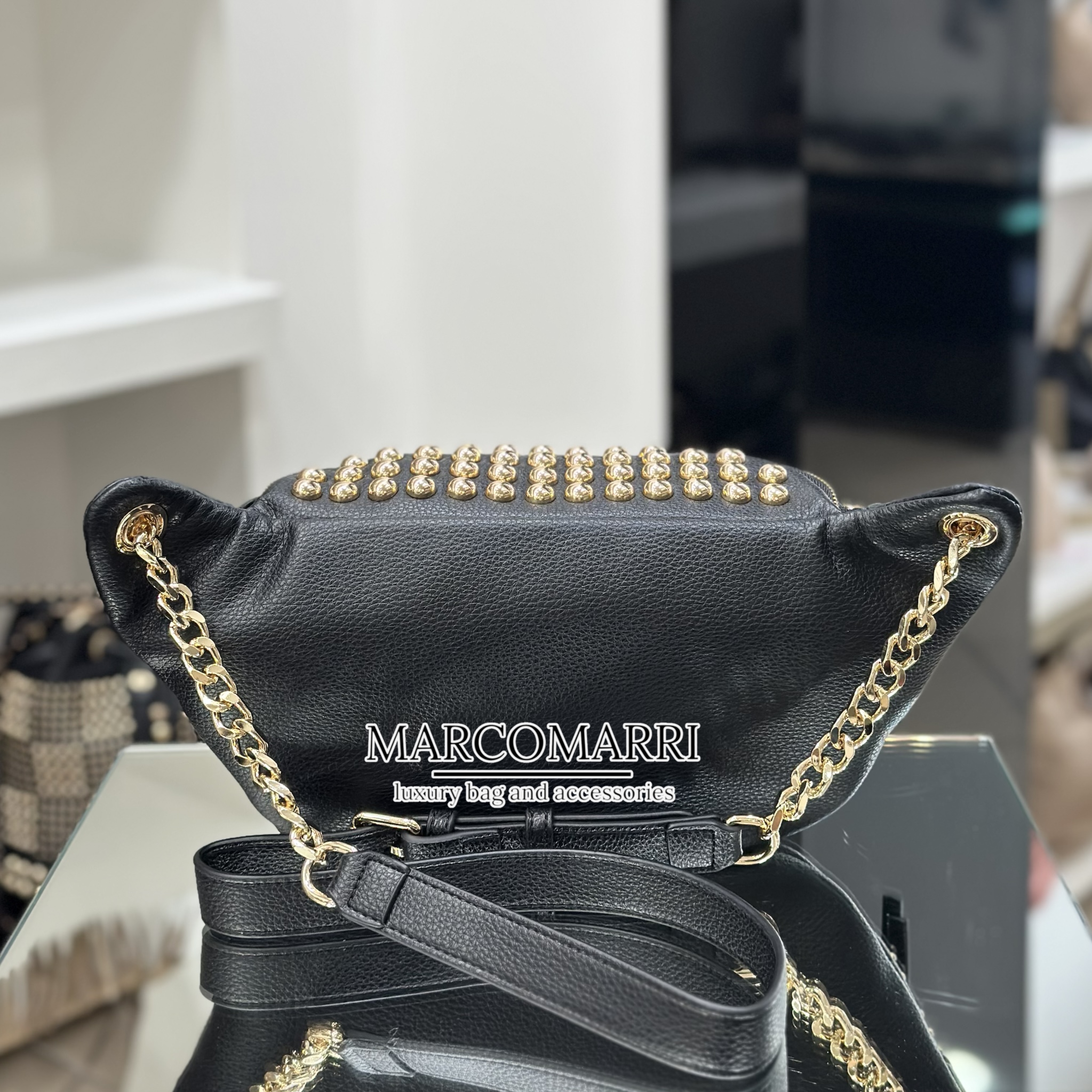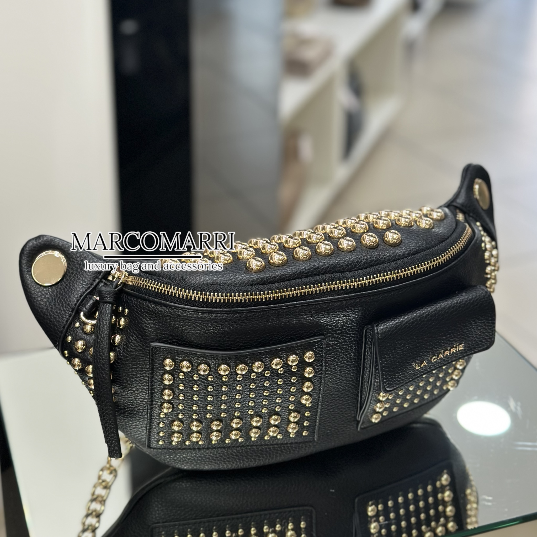 Marsupio con tasche esterne, rifinito con borchie oro.
